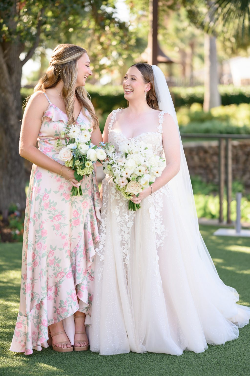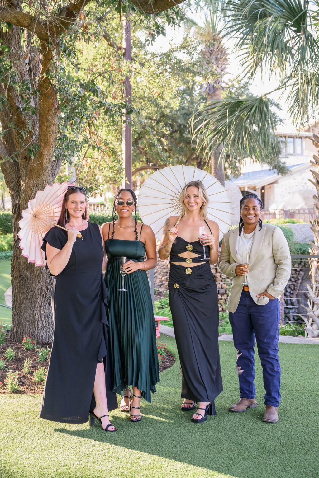 On the wedding day, guests arrived to an outdoor ceremony on the resort’s lush lawn, where pre-ceremony champagne and soft pink parasols added a whimsical touch.