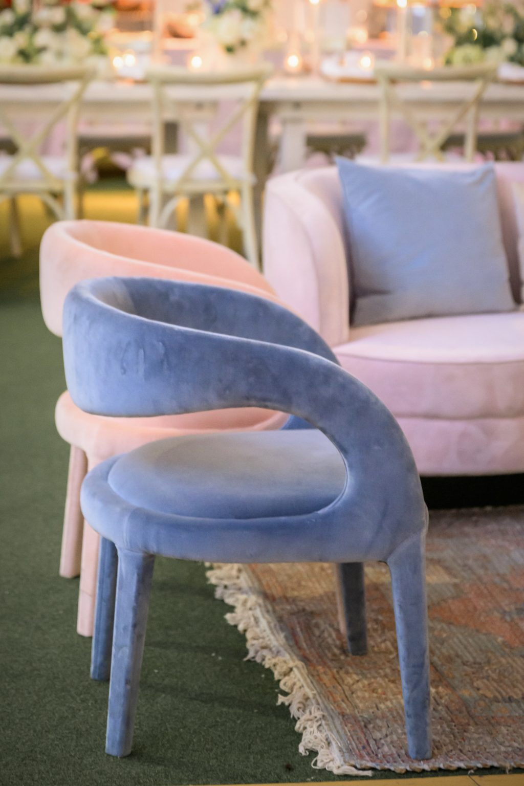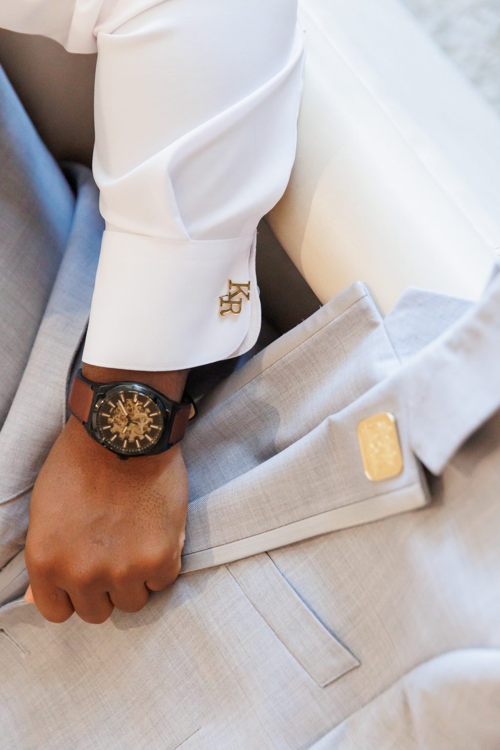 Reggie chose a gray tuxedo from Men’s Wearhouse, accented with a blush pocket square and tie, subtly tying into their romantic color palette of soft pinks and blues.