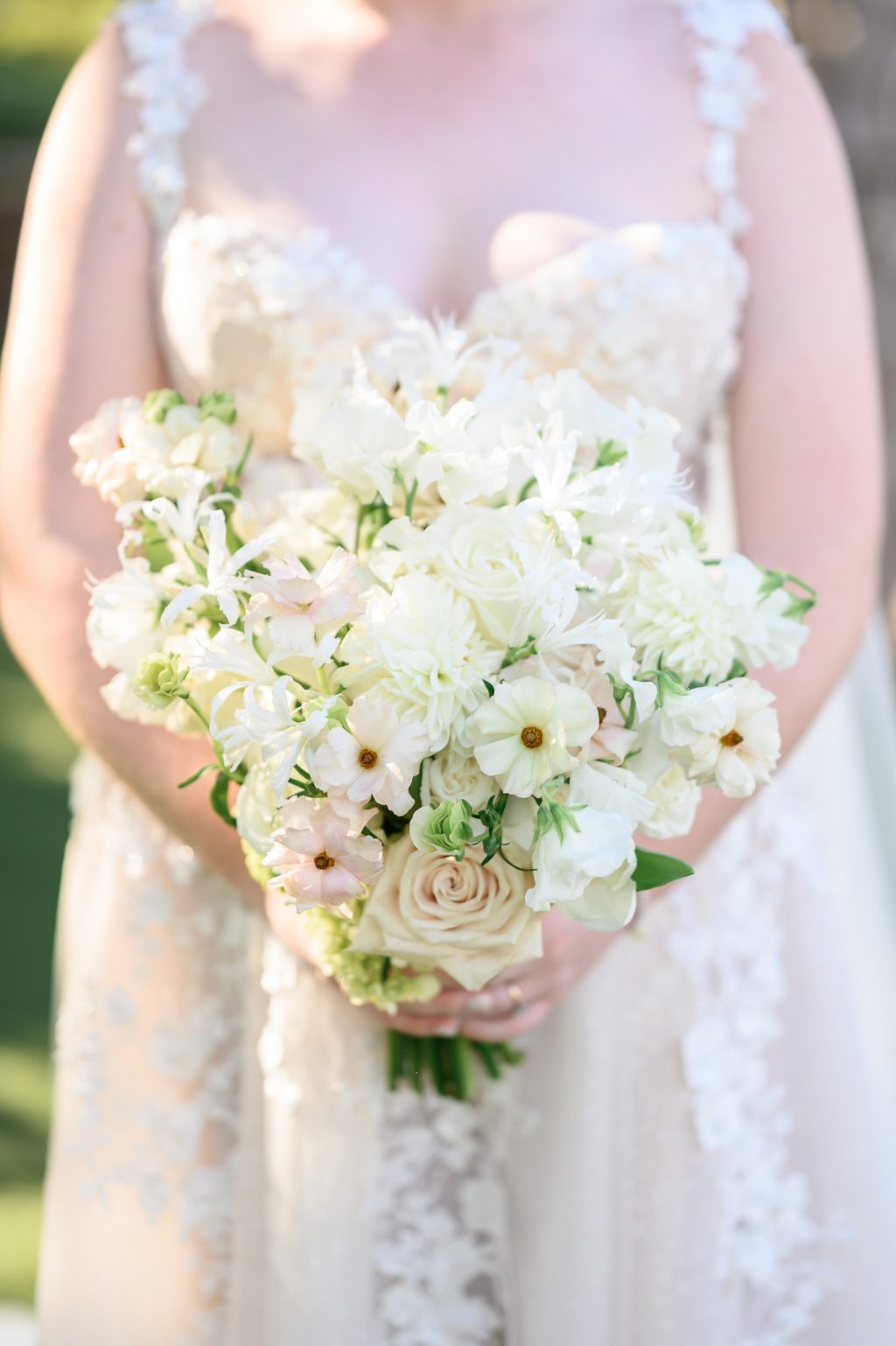 Kelli walked down the aisle in a Galia Lahav gown, featuring delicate lace details and a flowing silhouette. She paired it with a cathedral-length veil, diamond earrings, and a vintage heirloom ring from her grandmother—her cherished “something old.”